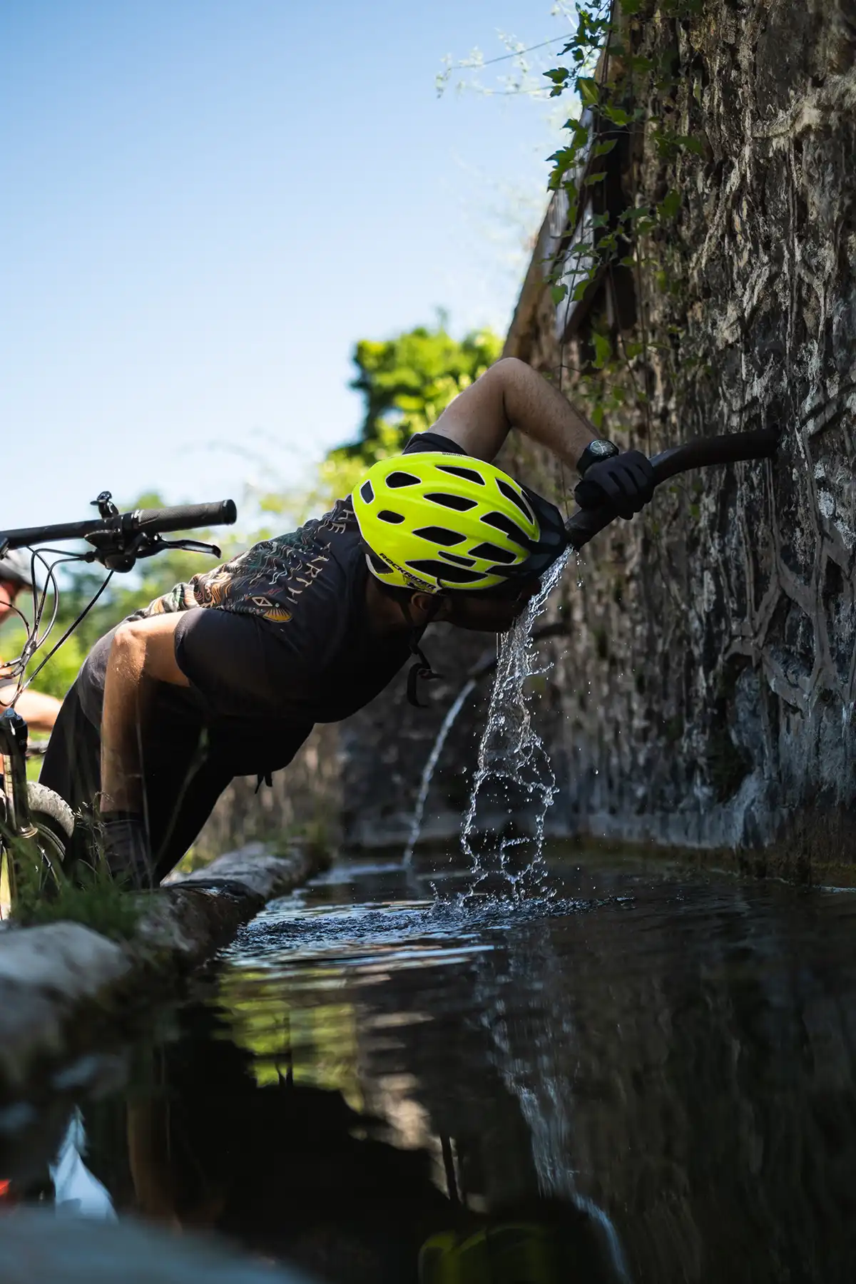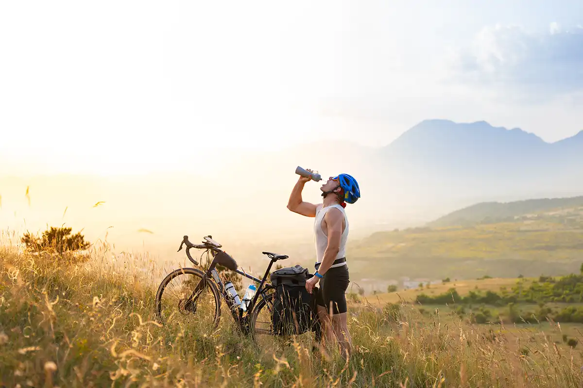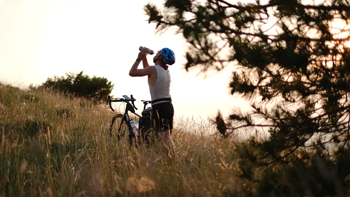 Ciclista che beve al tramonto durante un servizio fotografico outdoor di Simone De Gasperis.
