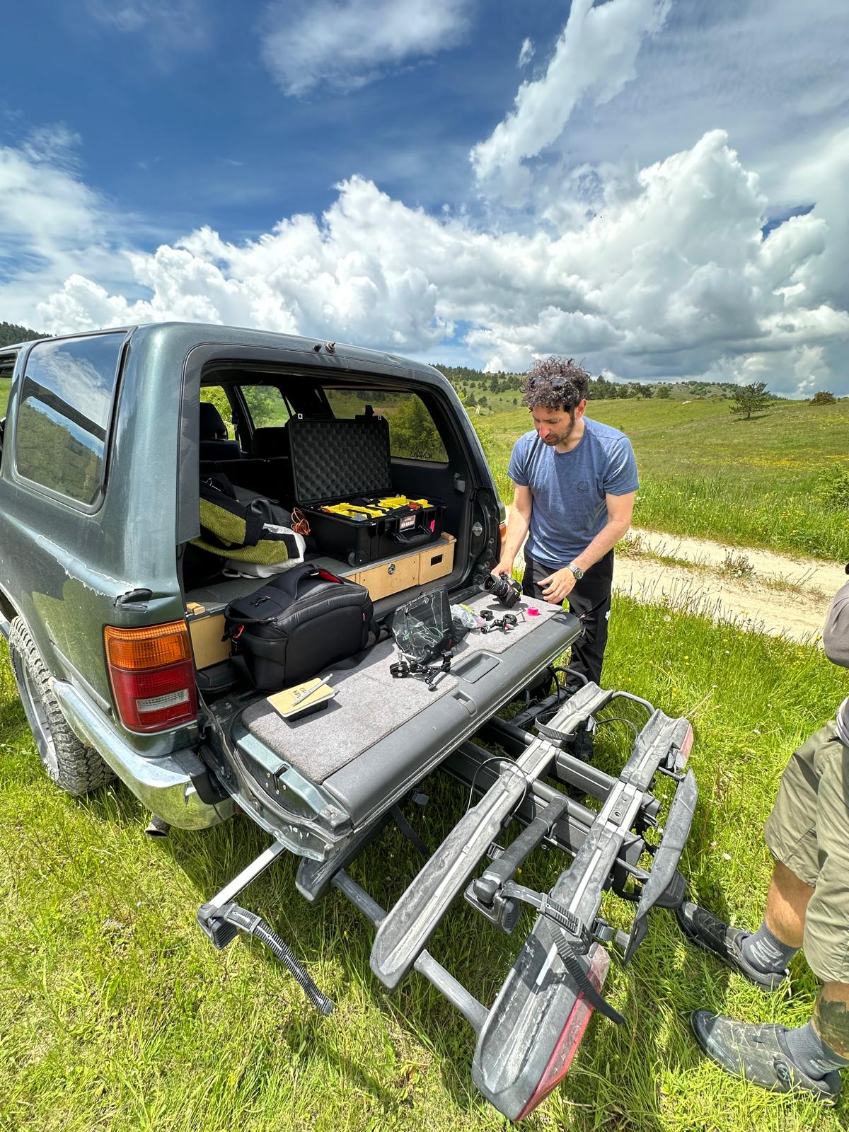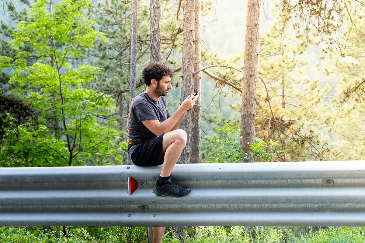 Il filmmaker Simone De Gasperis impegnato in riprese outdoor con attrezzatura professionale durante un progetto di cicloturismo
