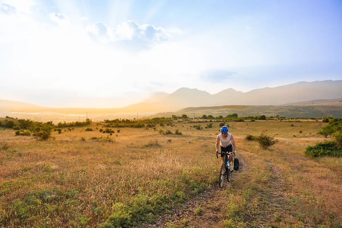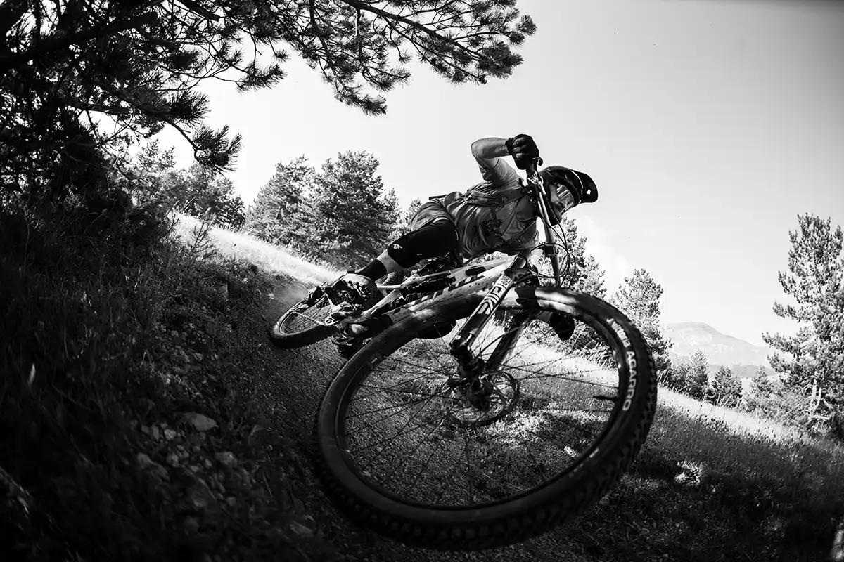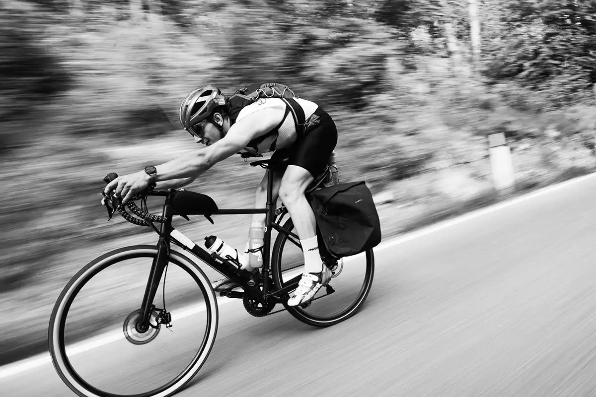Fotografia d'azione di un ciclista impegnato in un percorso di bikepacking realizzata da Simone De Gasperis